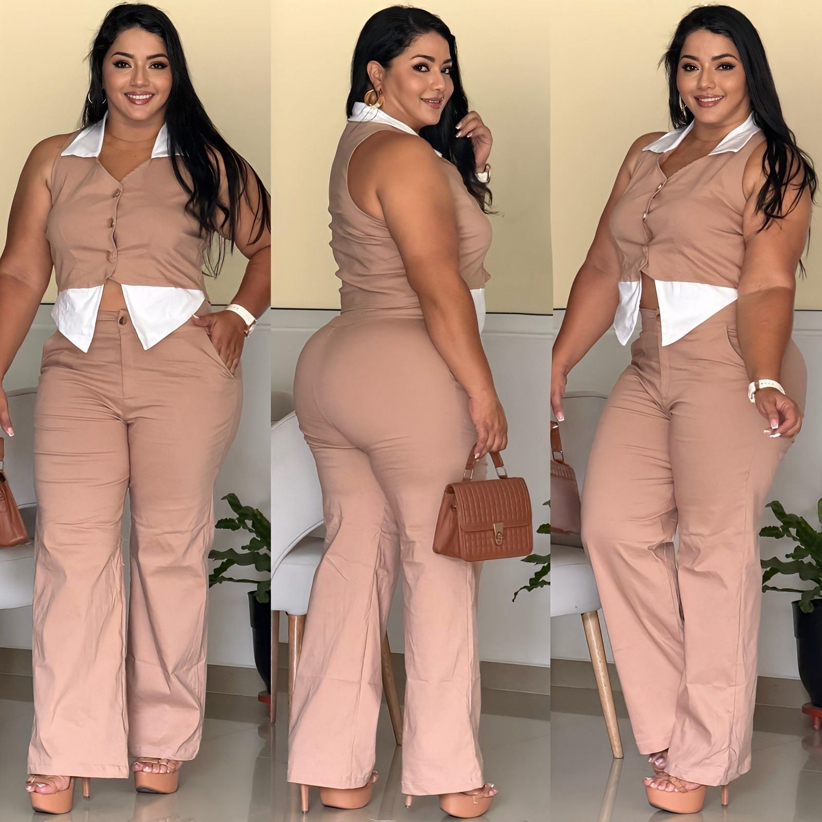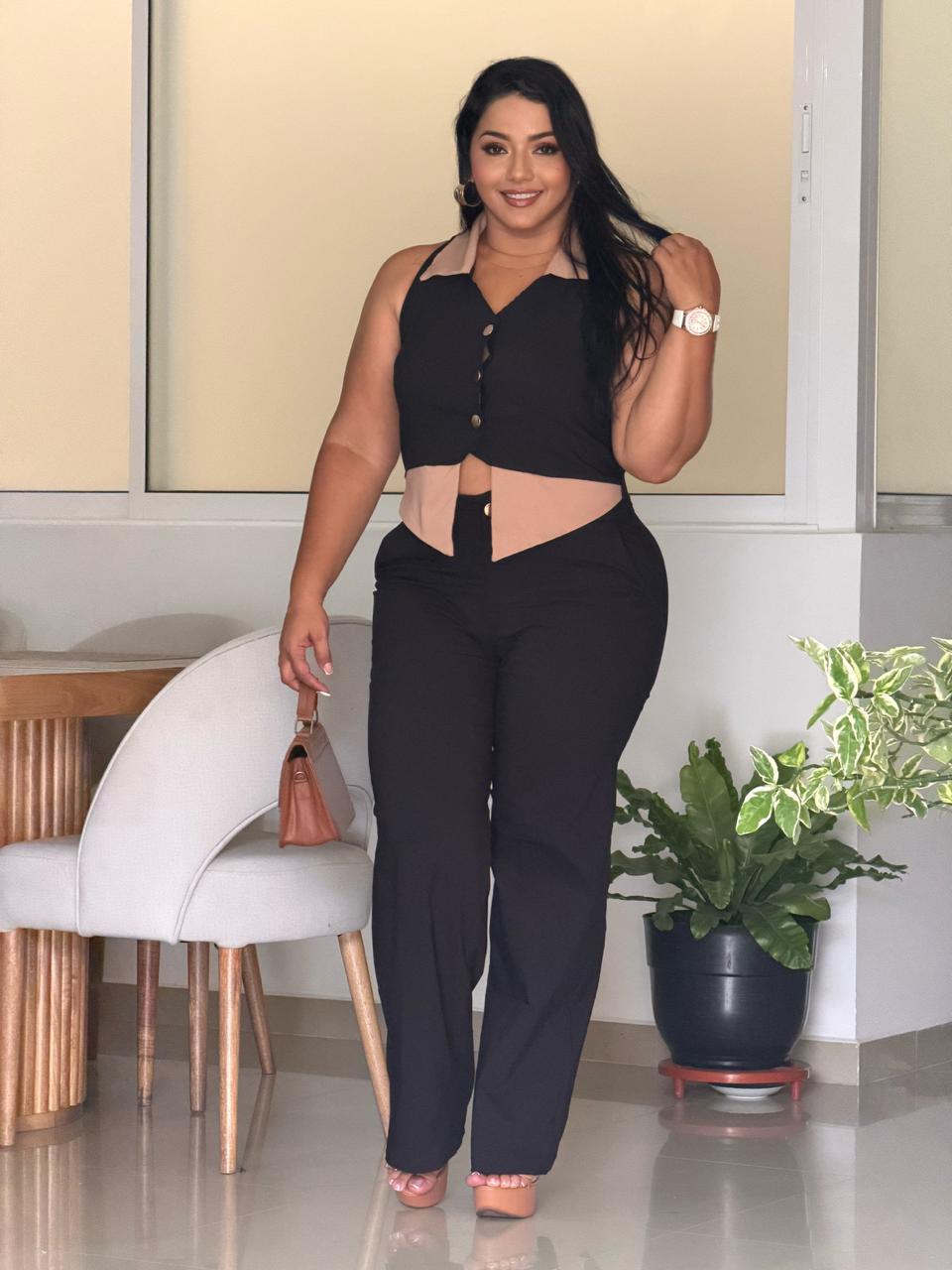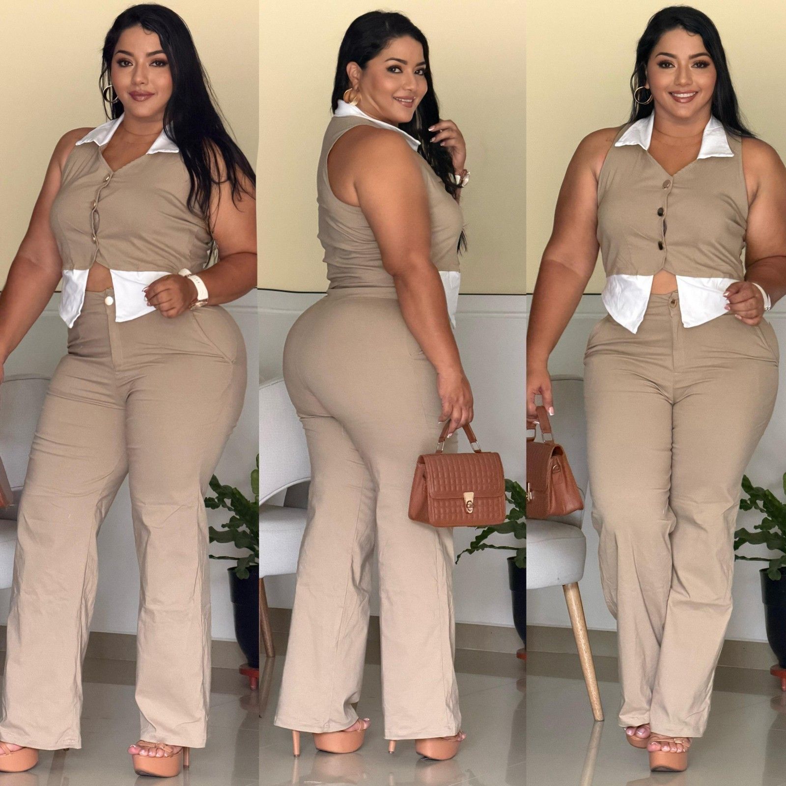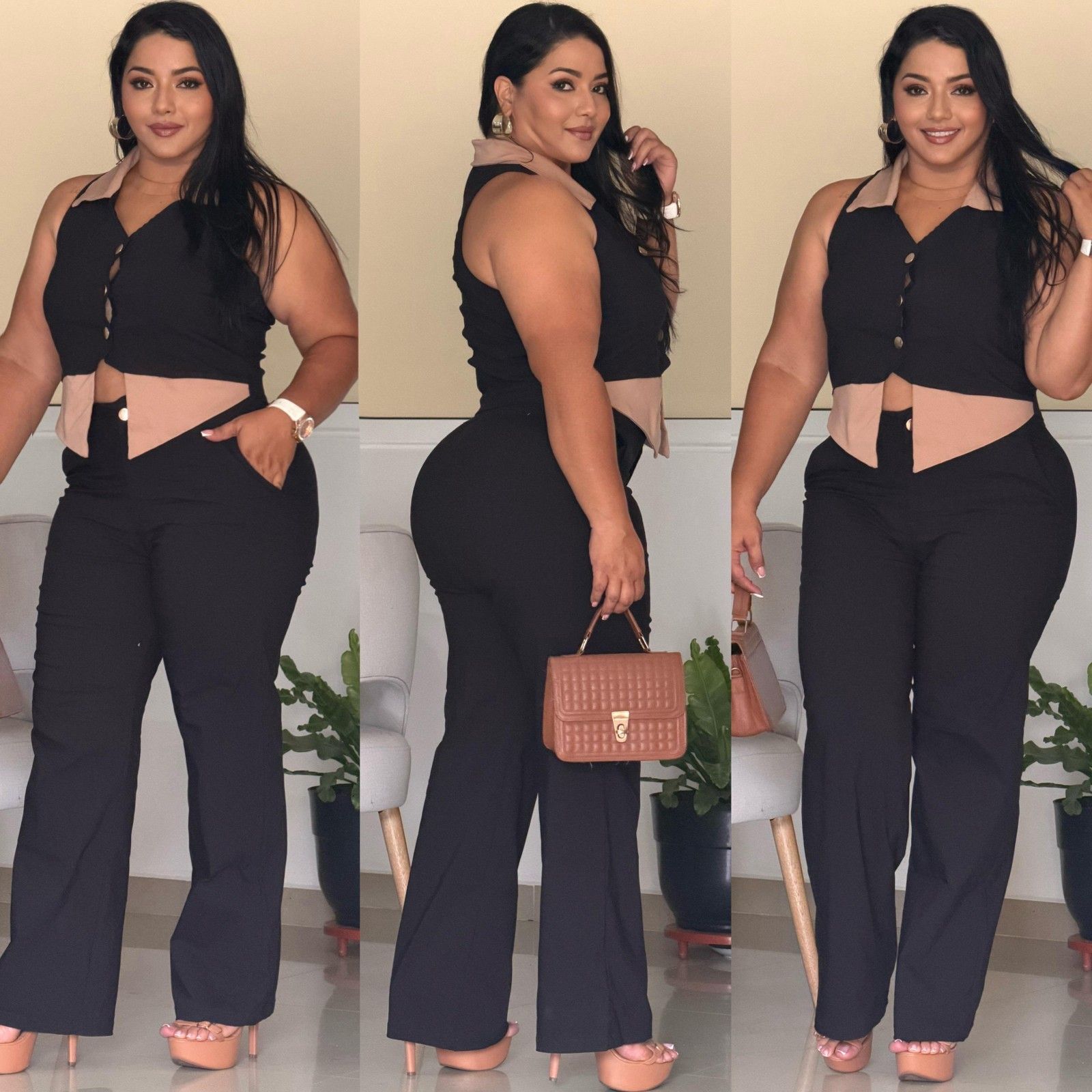 Conjunto de dos piezas para mujer en tallas plus, diseñado para realzar la figura con un ajuste cómodo y moderno.
